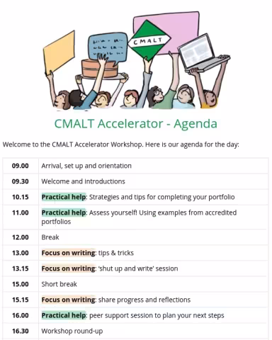 Anyone registered for CMALT who is keen to complete their portfolio more quickly, candidates who are working towards CMALT looking for more support and anyone looking to revise a referred portfolio. If you are not already on a CMALT pathway you can find out more information here, including details on how to register for the accreditation process.