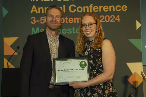 Speaking about the award, Julie said: "I am delighted to be awarded honorary life membership of ALT and to receive the award in Manchester, where my learning technology career started, made it extra special. ALT has played a significant role in my professional life for over 20 years. Throughout this time, I’ve had the privilege of contributing to and learning from this incredible community through a range of activities, such as Deputy Editor for the ALT newsletter, co-chairing the 2012 conference in Manchester, chairing the M25 Learning Technology Group, and serving as a CMALT assessor.