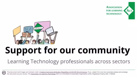 As part of our efforts, ALT is runing a series of expert webinars on how we run events online. ALT has been running fully online and blended events successfully for many years. Our Online Winter Conference attracts hundreds of participants each year and we are now receiving many requests to share our expertise. In these webinars ALT senior staff Martin Hawksey and Maren Deepwell will share their expertise on how we run online conferences, lessons learnt and common considerations if you are about to embark on this yourself. Openly sharing our approach to leading ALT's staff team is a key part of the work we do, and we publish a regular blog series on this topic, see https://marendeepwell.com/?page_id=2070.