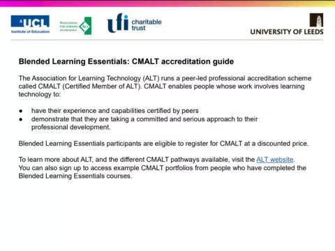 The mapping allows Associate CMALT candidates to utilise their work from all four of the Blended Learning Essentials courses provided by the University of Leeds, and specific unit mapping can be found here.