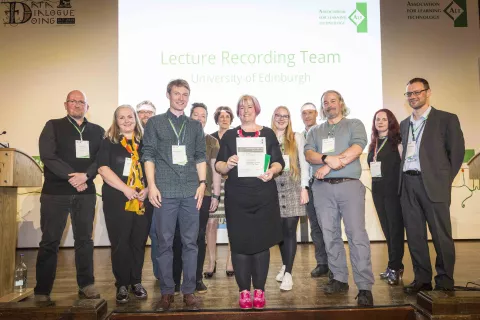 The winner in the Team Awards is the University of Edinburgh Lecture Recording Team. Congratulating the team on the win, the panel described why the entry was chosen thus: although lecture capture is an area of interest to many universities, what was most impressive about this entry was that it provides an exemplar for the implementation of any learning technology. The careful consideration of the perspectives of educators and students, coupled with a practical and responsive implementation makes for an effective model. The open ethos and sharing approach of the project for the benefit of the wider sector is also excellent practice.