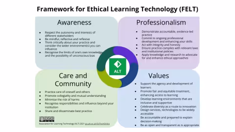 ALT invites you to join an open working group to update ALT’s Framework for Ethical Learning Technology (FELT). FELT was developed and published in 2021 and we are now updating the framework to reflect the developments in learning technology since its inception. Find out more about how FELT was developed.