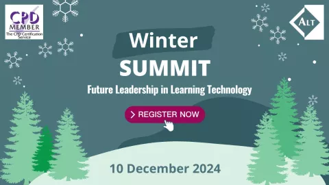 We are excited to present the programme for the ALT Winter Summit 2024, which is centred around the theme of “Future Leadership in Learning Technology”. This year, we've shaken up the format of our Winter Summit to create an interactive, collaborative event with plenty of opportunities for knowledge sharing and networking. Join us online for a full day of engaging sessions on Tuesday 10 December 2024, from 9:00 AM to 5:30 PM GMT.